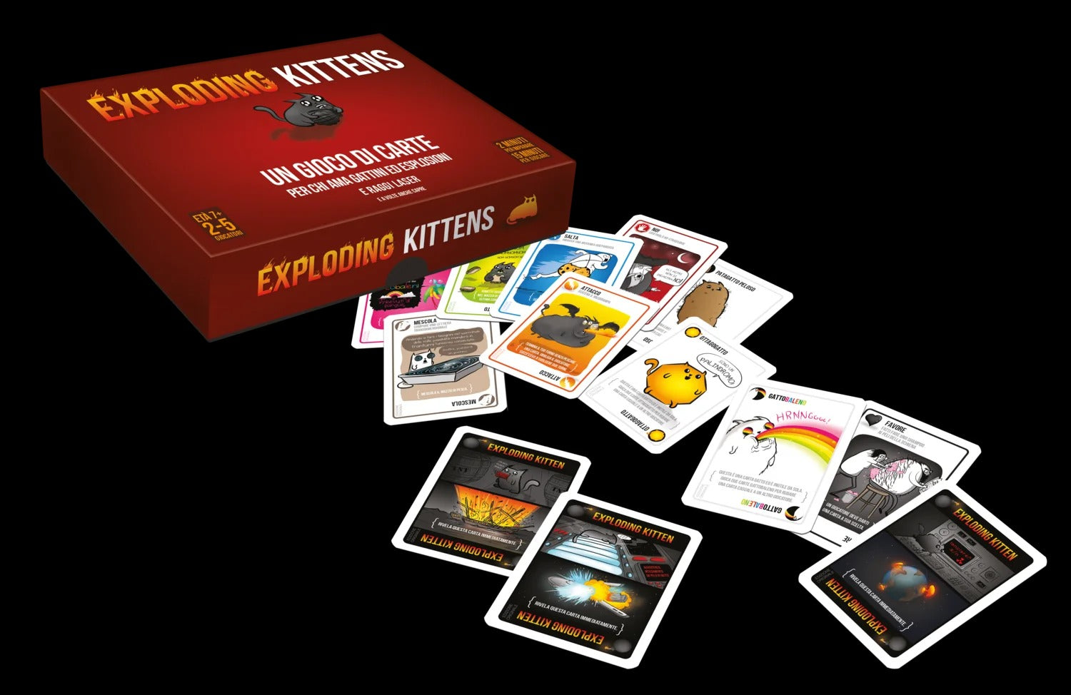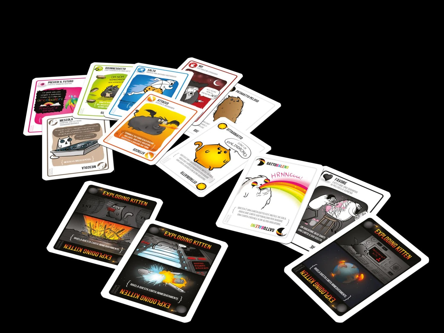 Il gioco è una versione altamente strategica e potentemente felina della roulette russa. I giocatori pescano carte fino a quando qualcuno non pesca una carta Exploding Kitten: a quel punto quel qualcuno esplode, è eliminato, è fuori dal gioco. A meno che quel giocatore non abbia una carta Disinnesgatto nella propria mano che possa disinnescare la carta Exploding Kitten come farebbero anche i puntatori laser, i grattini sulla pancia o i sandwich di erba gatta. Tutte le rimanenti carte nel mazzo vengono usate per spostare, attenuare o evitare le carte Exploding Kitten.