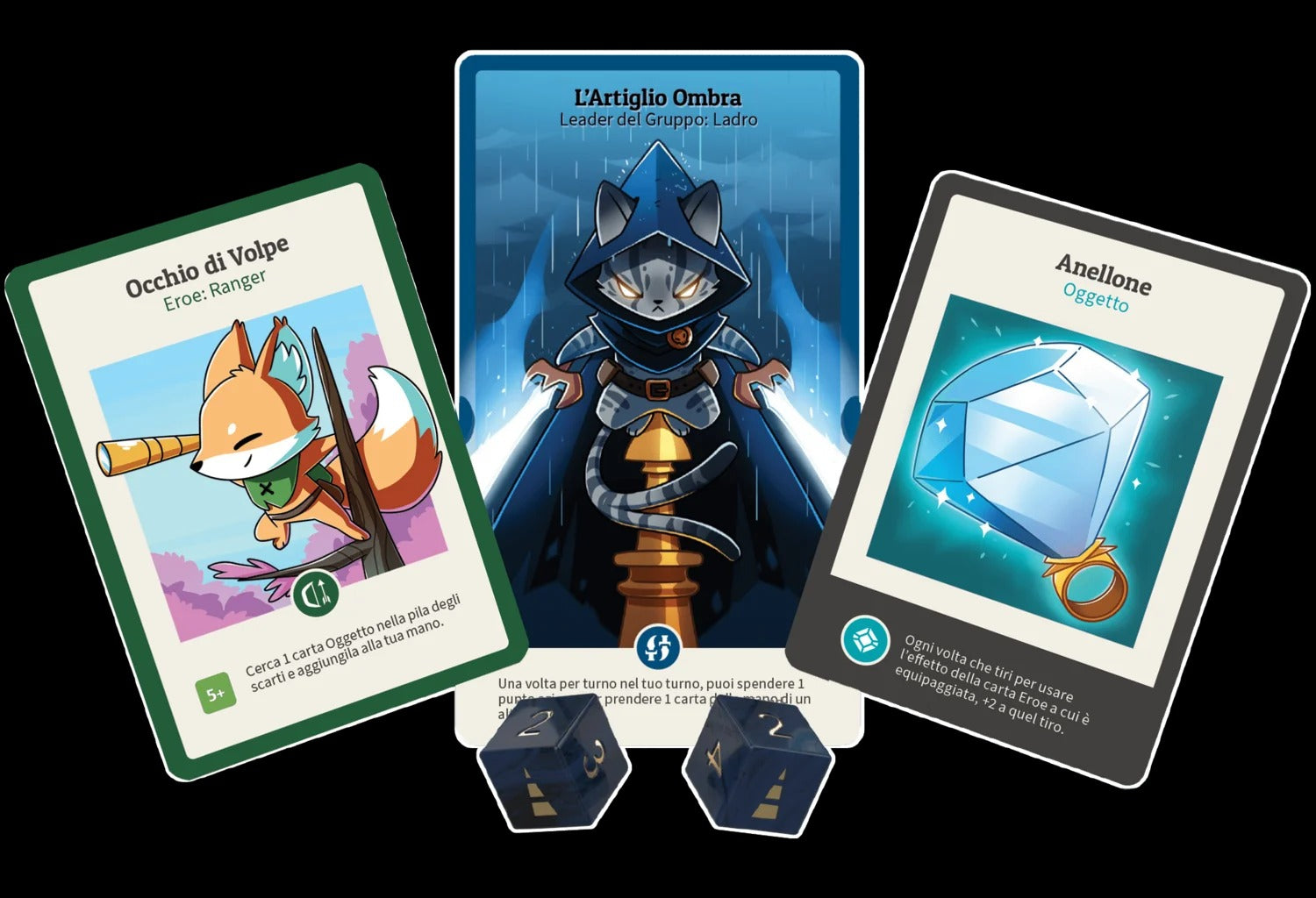 giocare carte (Carte Eroe – Carte Oggetto per equipaggiare gli eroi e Carte Magia, istantanee);