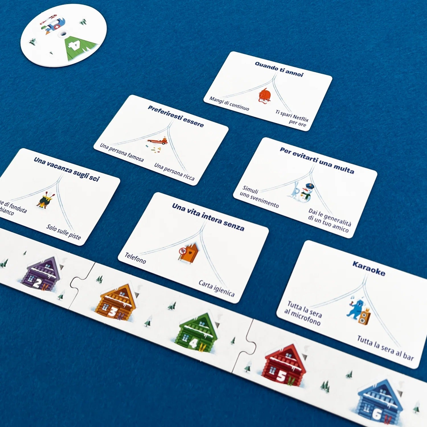 Le carte sono disposte con uno schema piramidale (la montagna) quindi, come in una storia a bivi, ogni scelta ci porterà a un’altra carta (più in basso) e così via fino a raggiungere una delle 8 case alla base della montagna.